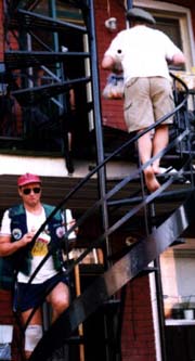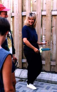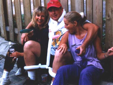 It was yet another beautiful day. Everyone is in a good mood having run one of the best runs of the summer, and its only one week to the 2nd annual red dress run. The hares took the pack down into Verdun and along the Aquaduct, we nearly lost new comer Drunken Emporium to a truly great check point (?!?), he rejoined us just in time to help the pack disturb a group of Sri Lankan Cricket players (there was no game going on here when the hares set the trail, and it ran right between to games). Midway we had a much needed beer break at Shelaghs place down near the Atwater Market, and she served up some really juicy fruit (orange slices) I believe this is how her hash name came about)) Eventually the pack wound its drunken self back to the car park. It was here Bl*w Job made some wonderful balloon creations for Yogi and Co., as seen in the photos.