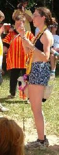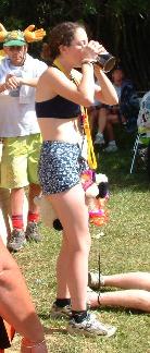 The remainder of the day went something like this: chapel service, NZGM's fine circle, or 'time for another game of Mexi'. This was because the new NZGM had been given some foul concoction by the outgoing GM and was making little or no sense. There was a hash wedding, Orgy and Snag being eternally united by the bonds of complete stupidity and lots of hard liquour. Mongo made the event more touching with selected readings from the Penthouse Favourites; "I Cum Home to Find that the Neighbour is Playing With Herself and the Next Day She Has a Friend Over", followed by "My Car Isn't R*nning Well, Can I Have a Lube Job?". Drinking games were next, with Snag, clothed in the requiste wedding gown, face down in the grass with a banana up his ass (envious of Mutton Drapes's freedom perhaps and acting out?). This set the stage for the down down competitions. The women's 1L was won/lost by BirdTable in approximately 12 seconds. This is even more impressive when you consider she is about 5' tall and weighs less than a large male german shepherd. Talk about a powerful suck. My own down down was still nothing to be scoffed at, finished in 20 seconds. The men's 2L was less of a competition and more of a spectacle. Throw up bin over here, please! Troll Up's barf/drink barf/drink barf/drink party trick was a real crowd pleaser. (ed note: wasn't that drink/barf drink/barf drink/barf?..)